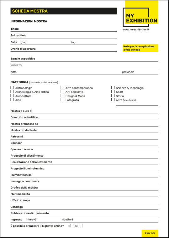Saranno catalogate esclusivamente le mostre che prevedono un biglietto d’ingresso diretto o cumulativo con un biglietto d’ingresso al museo o allo spazio espositivo.